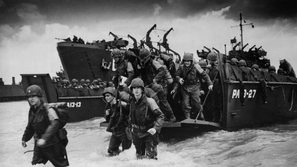 6th June 1944: Reinforcements disembarking from a landing barge at Normandy during the Allied Invasion of France on D-Day. (Photo by Hulton Archive/Getty Images)