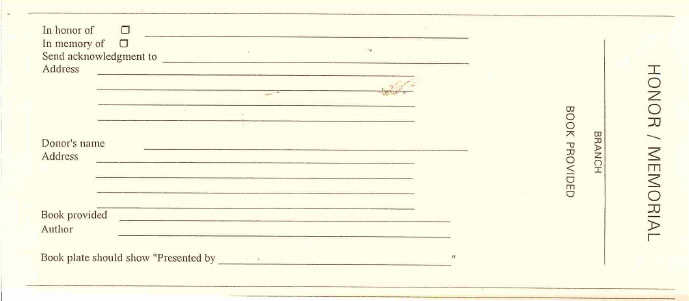 Books and other materials make excellent memorials. When a donation is received as a memorial the donor may designate what type of book needs to be purchased. The library sends an acknowledgment to the family of the deceased as well as the donor. A memorial book plate will be placed in the book indicating the book was donated in memory of the deceased. The book will be housed in the branch chosen by the donor.