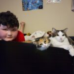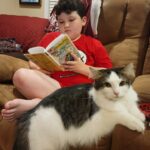 - Cole reads while his cat stretches out